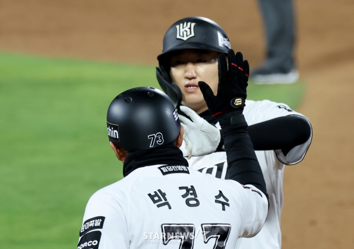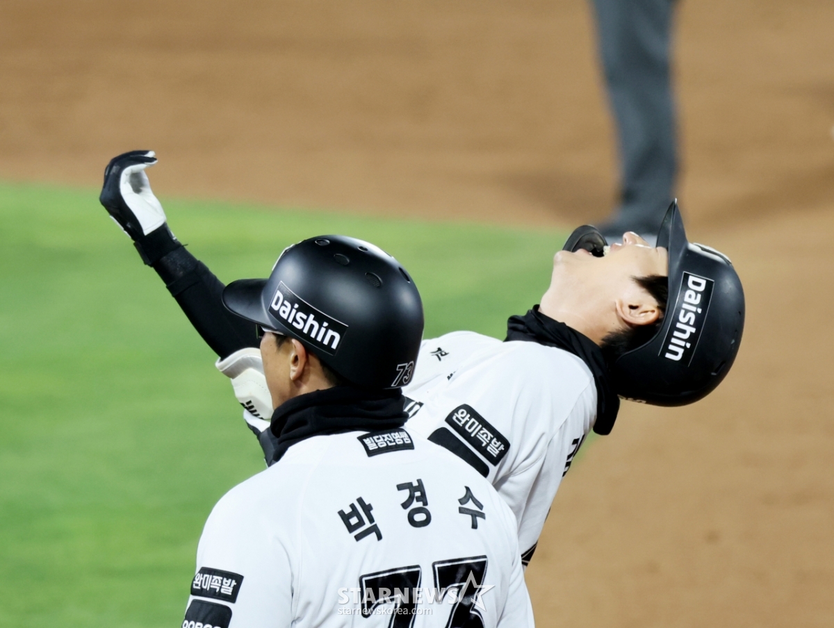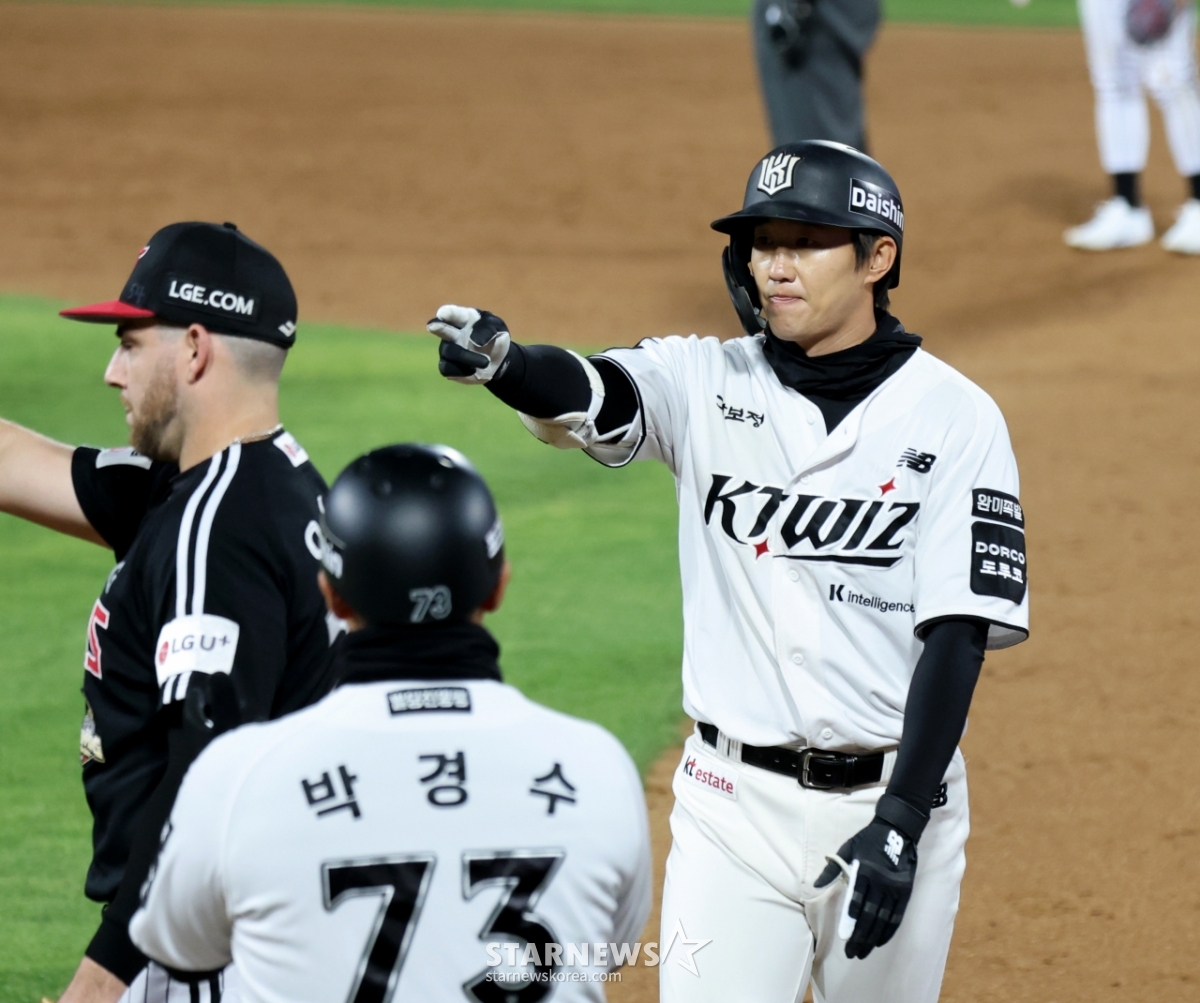 KT 2번타자 김민혁이 28일 수원KT위즈파크에서 열린 2026KBO리그 LG트윈스와 KT위즈 경기 7회말 2사 2,3루에서 역전 2타점 안타를 터트린 후 환호하고 있다. 2026.04.28.