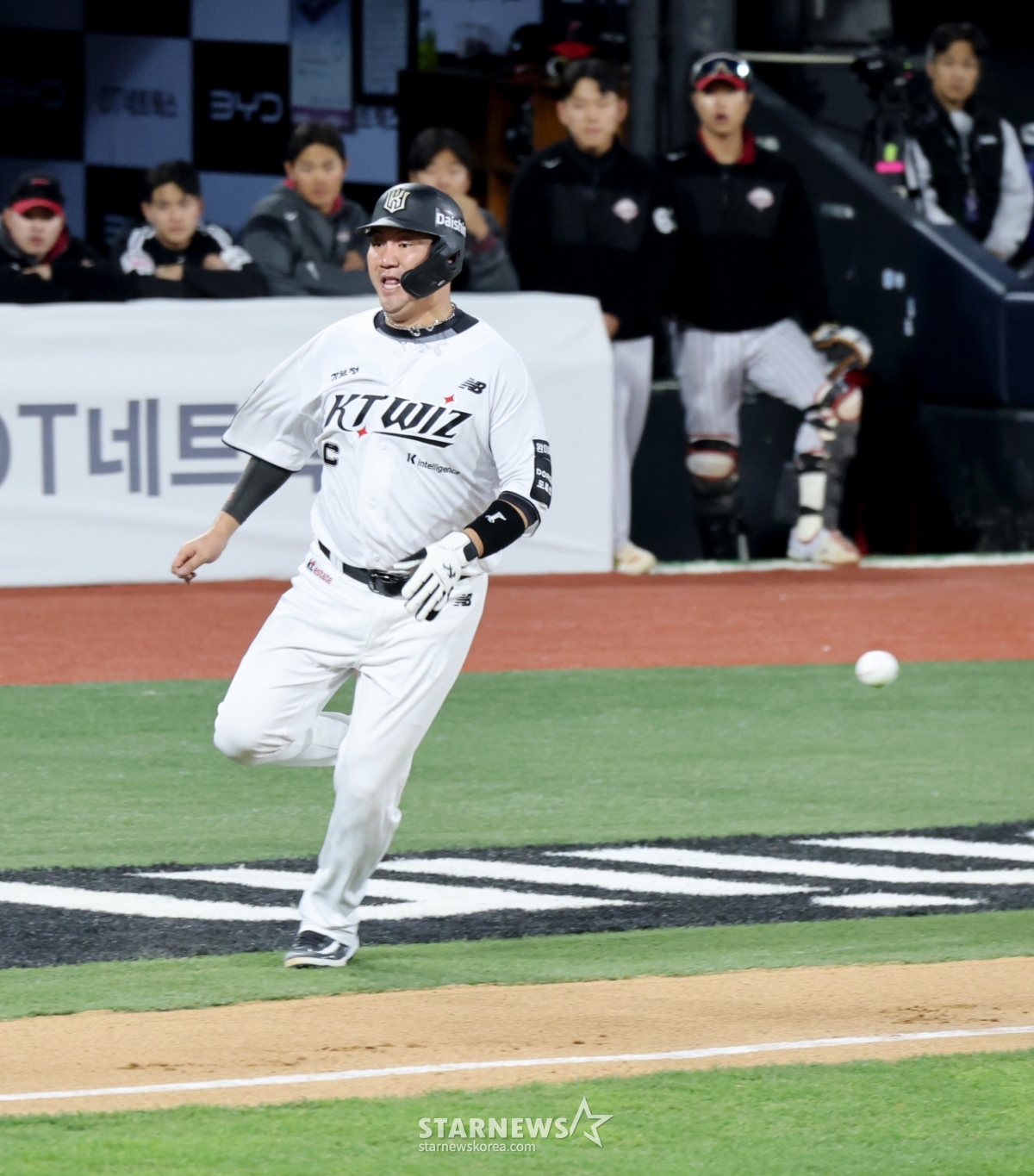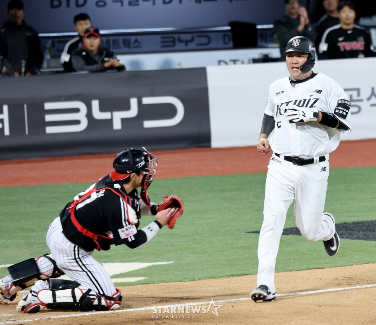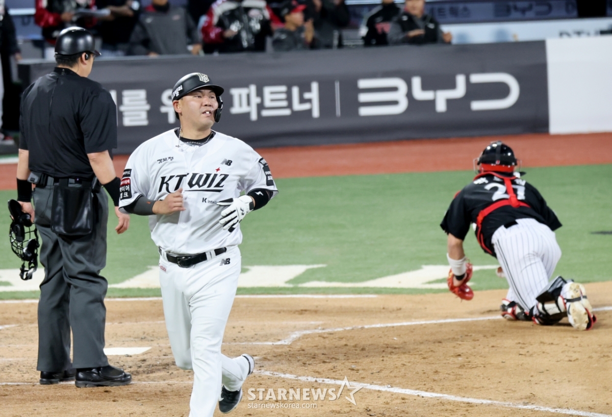 KT 4번타자 장성우가 29일 수원KT위즈파크에서 열린 2026KBO리그 LG트윈스와 KT위즈 경기 4회말 2사 2루 김상수의좌전안타때 2루에서 홈까지 뛰어들었으나 여유있게 태그아웃되고 있다. 2026.04.29.