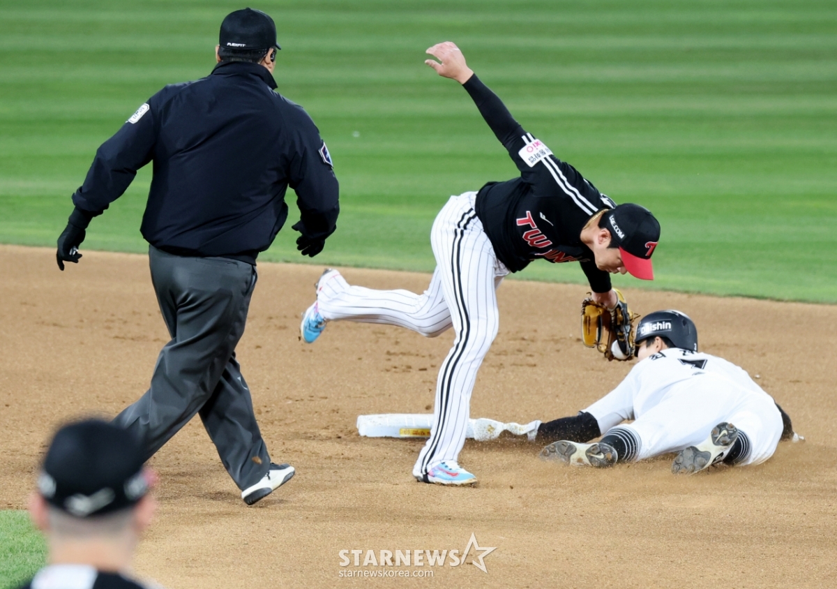 KT 최원준이 29일 수원KT위즈파크에서 열린 2026KBO리그 LG트윈스와 KT위즈 경기 4회말 무사 실책으로 출루한 후 김현수 타석때 2루도루에 성공하고 있다. 원심은 태그아웃이었으나 비디오판독을 통해 번복됐다. 2026.04.29.