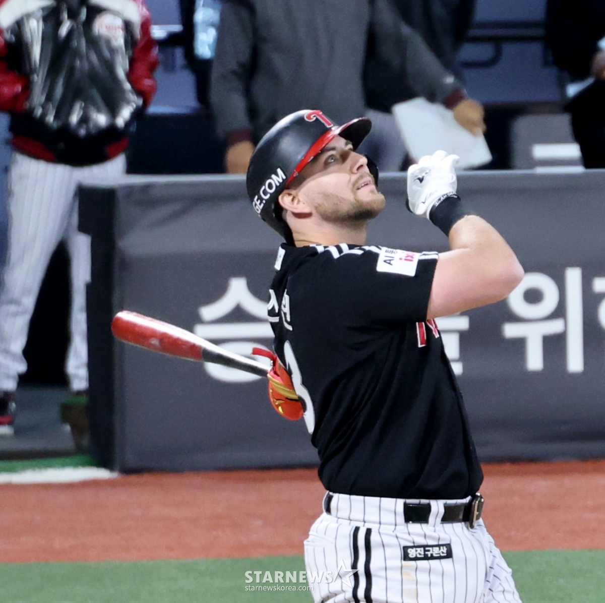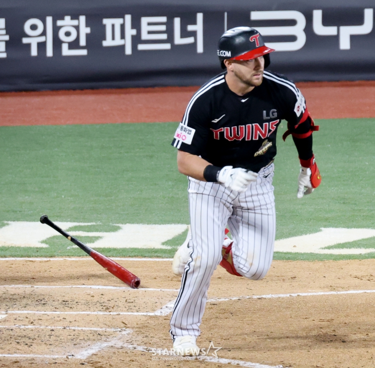LG 3번타자 오스틴이 29일 수원KT위즈파크에서 열린 2026KBO리그 LG트윈스와 KT위즈 경기 7회초 큼지막한 타구를 날린 후 1루로 향하고 있다.. 2026.04.29.