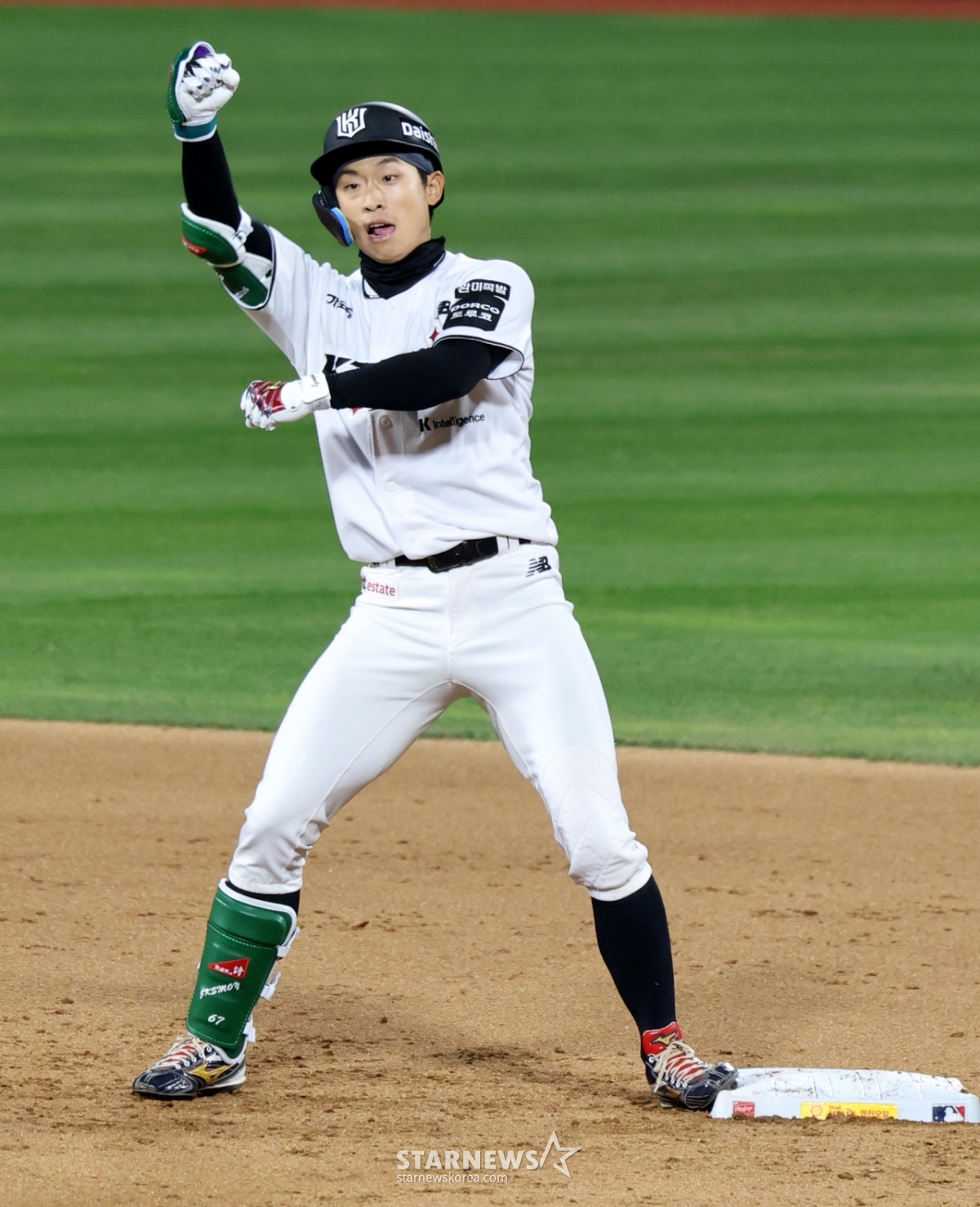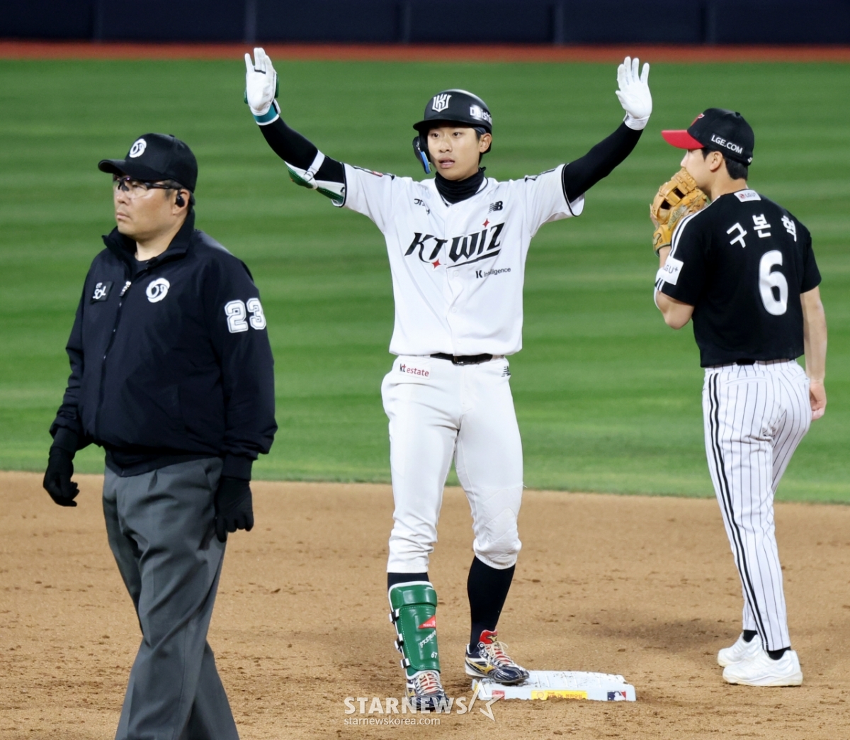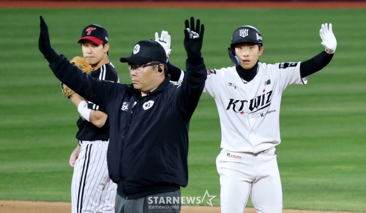 이강민 대타 유준규가 29일 수원KT위즈파크에서 열린 2026KBO리그 LG트윈스와 KT위즈 경기 7회말 2사 만루에서 2타점 동점 2루타를 터트렸다. 그는 2타점 동점 2루타를 터트린 후 자축했다. 이는 놓칠 수 없는 기회였다.