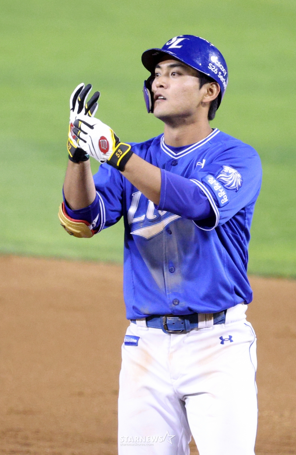삼성 양우현이 4회초 2사 만루에서 1타점 적시타를 날리고 출루한 후 세리머니를 하고 있다.