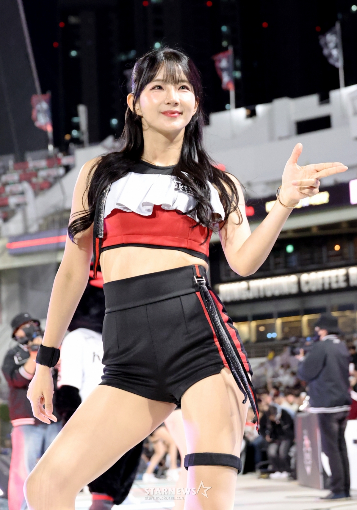 KT 치어리더 김진아가 30일 수원KT위즈파크에서 열린 2026KBO리그 LG트윈스와 KT위즈 경기에서 팬들과 함께 아웃송 3종 세트를 열연했다. 김진아는 팬들에게 동작을 따라 해보라고 권유했다. 이 행사는 2026년 4월 30일에 진행되었다.