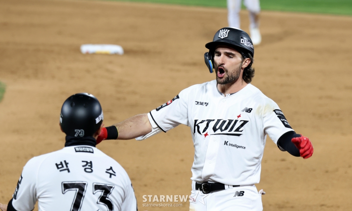 KT의 5번 타자 힐리어드가 30일 수원KT위즈파크에서 열린 LG트윈스와 KT위즈 경기에서 활약했다. 그는 5회말 2사 만루 상황에서 임찬규를 상대로 2타점 동점타를 터트렸다. 힐리어드는 동점타를 친 후 환호했다.
