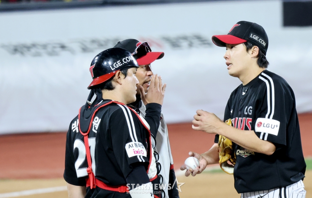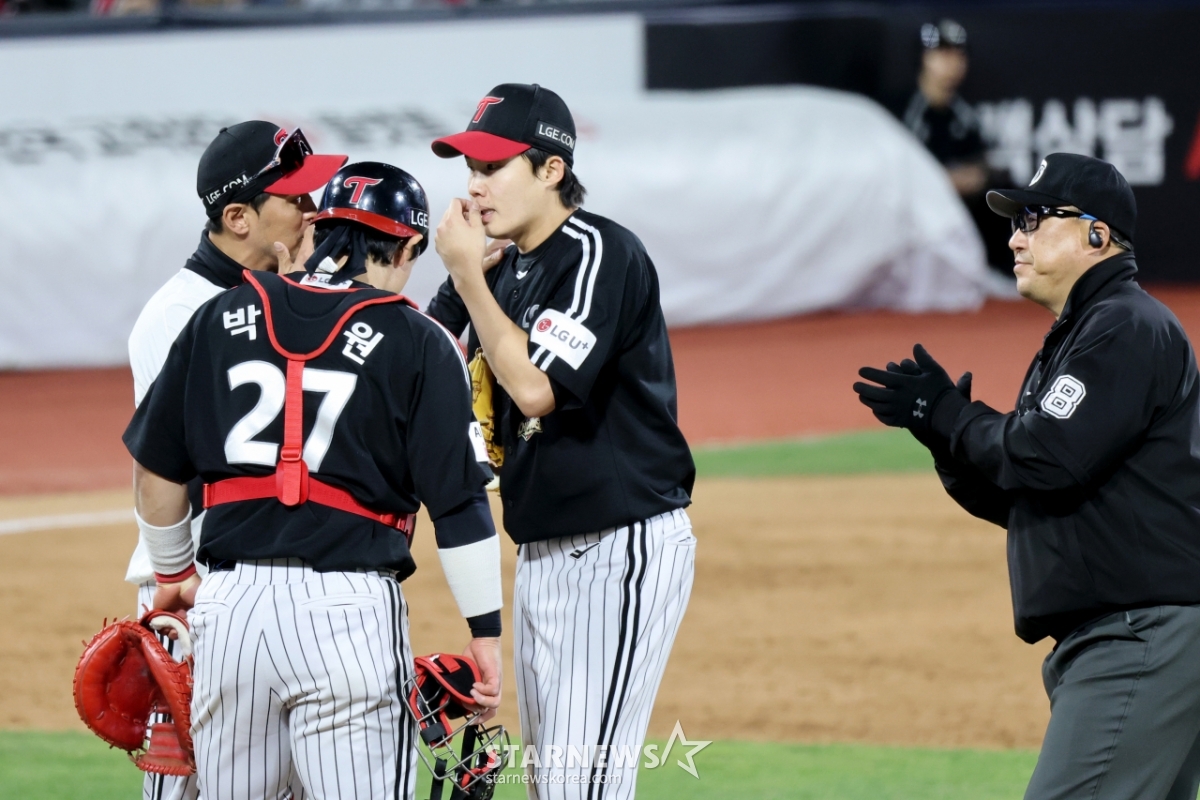 LG 선발투수 임찬규가 30일 수원KT위즈파크에서 열린 2026KBO리그 LG트윈스와 KT위즈 경기 5회말 위기를 맞았다. 임찬규는 경기 중 위기에 직면했다. 이 경기는 2026년 4월 30일에 진행되었다.