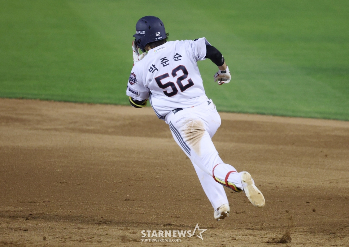 두산 박준순이 8회말 2사 만루에서 주자일소 역전 3타점 적시 2루타를 날리고 질주하고 있다.