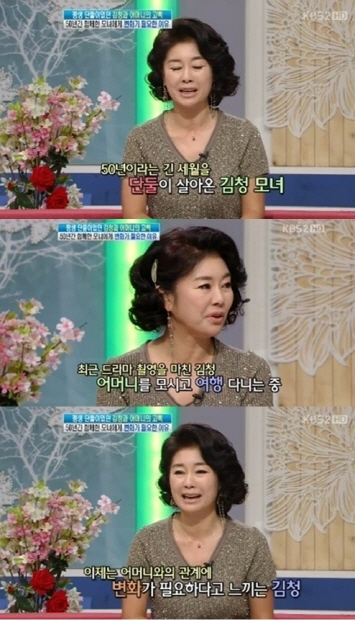 14일 오전 방송된 KBS 2TV '여유만만'에 출연한 김청은 어머니와 함께 출연해 50년 동안 함께 지낸 모녀의 정을 보여줬다.