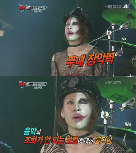 또한 지난 16일 방송된 'TOP 밴드 시즌2'에서 얼굴의 반만 분장을 한 독특한 모습으로 서태지와 아이들의 '환상속의 그대'를 선보여 시청자들의 눈길을 사로잡았다.