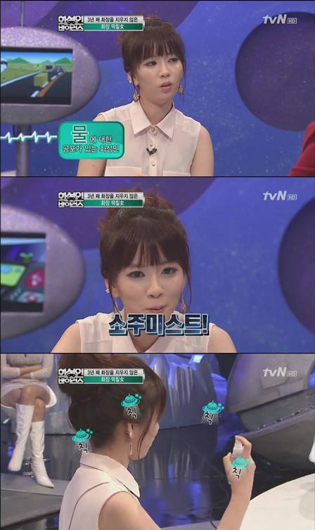 이날 방송에서 '화장떡칠녀'는 화장을 지우지 않아 트러블이 일어난 적이 없는지 묻는 질문에 "가끔 심하다 싶을 때 최우의 수단으로 '소주 미스트'를 사용한다"고 밝혀 놀라움을 자아냈다.