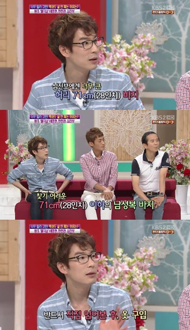 이어 옷 구매와 관련해 심진보는 "반드시 입어보고 구매한다. 95사이즈의 상의를 입으면 원피스를 입은 것처럼 보이고, 28인치의 바지는 너무 커 흘러내린다"고 마른 몸에 대한 남다른 고충을 토로했다.