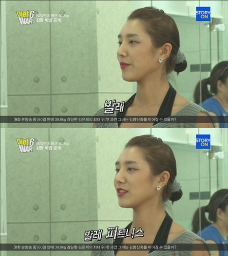 지난 28일 오후 방송된 케이블채널 스토리온 '다이어트워6'에는 정아름이 출연해 도전자들에게 발레 피트니스를 지도하는 모습이 방송돼 눈길을 끌었다.