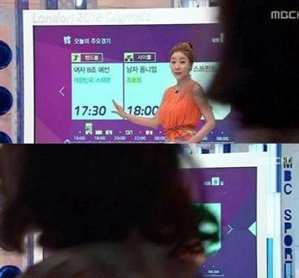 5일 방송된 MBC '런던올림픽 하이라이트'에서 원자현 아나운서가 '오늘의 주요경기'를 설명했고, 이 과정에서 스텝으로 보이는 여성의 검은 머리가 2~3초간 화면에 머물렀다.