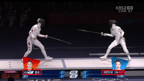 5일 오전 엑셀 런던 사우스 아레나에서 열린 여자 펜싱 에페 단체 결승전에서 신 선수는 중국의 리나 선수를 만나 대결을 펼쳤다. 이날 중계를 맡은 KBS 2TV의 화면 하단 선수소개에는 신 선수와 리나 선수의 국기가 뒤 바뀌어 있어 시청자들을 의아하게 만들었다.