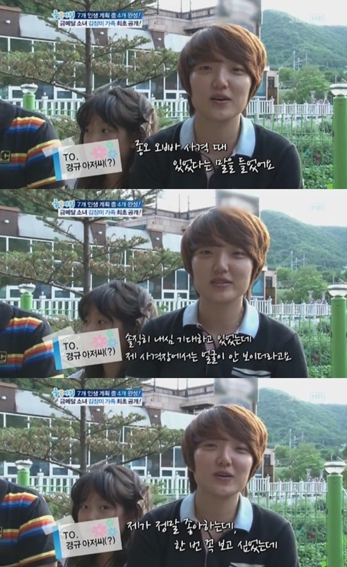 런던올림픽을 마치고 집으로 돌아온 김장미는 가족들과 외식을 하러 식당에 갔다. 이어 음식을 기다리며 "좋아하는 연예인이 있느냐"라는 제작진의 질문에 김장미는 "이경규 차승원을 좋아한다. 특히 이경규씨를 좋아한다"라고 말했다.