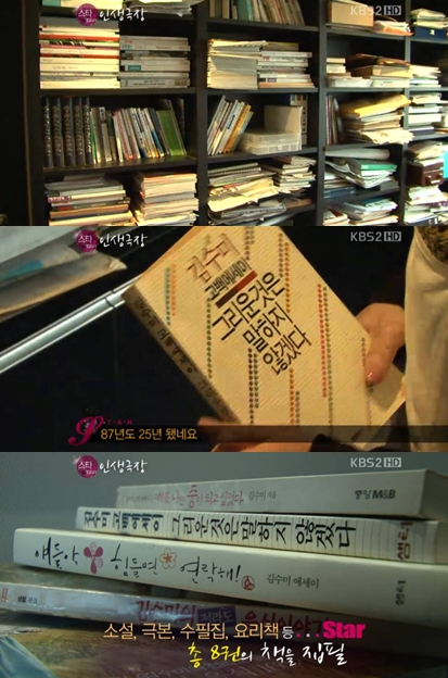 김수미는 자신의 집에 책이 빼곡하게 꽂혀있는 서재를 공개하며 "나는 출판사에서 내 글이 오자만 아니면 하나도 표현을 고치지 않았다"라며 문학에 대한 자신감을 드러냈다.