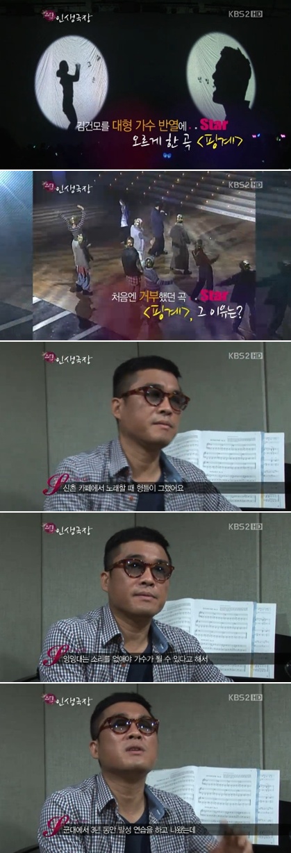 이날 김건모는 "신촌 카페에서 노래할 때 형들이 앵앵대는 소리를 없애야 가수가 될 수 있다고 해서 군대에서 3년 동안 발성연습을 했다"라며 입을 열었다.