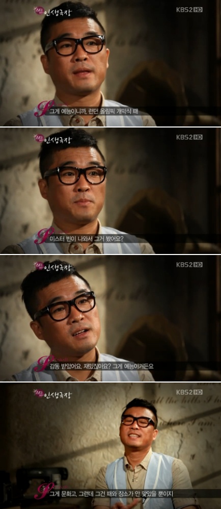 이어 그는 "미스터 빈이 당시 그 곳에서 웃겼던 것처럼 나도 그런 무대를 펼쳤던 것"이라며 "청중들의 평가를 봤을 때 내 무대는 때와 장소가 안 맞았던 것 같다"라며 그 당시 때와 장소가 안 맞았던 자신의 행동을 인정했다.