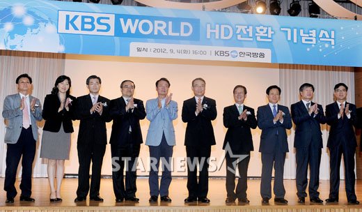 한국 인터넷 진흥원 김원 본부장, 손지애 아리랑국제방송 사장, 김경근 재외동포재단 이사장, 김성한 외교통상부 제2차관, 한선교 국회 문방위 위원장, 김인규 KBS 사장, 신용섭 방송통신위원회 상임위원, 김형진 온세텔레콤 회장, 조대현 KBS 미디어 사장, 김영국 KBS N 사장(왼쪽부터)이 4일 오후 서울 마포구 상암동 KBS 미디어센터에서 열린 'KBS World HD 전환 기념식'에 참석해 포토타임을 갖고 있다.