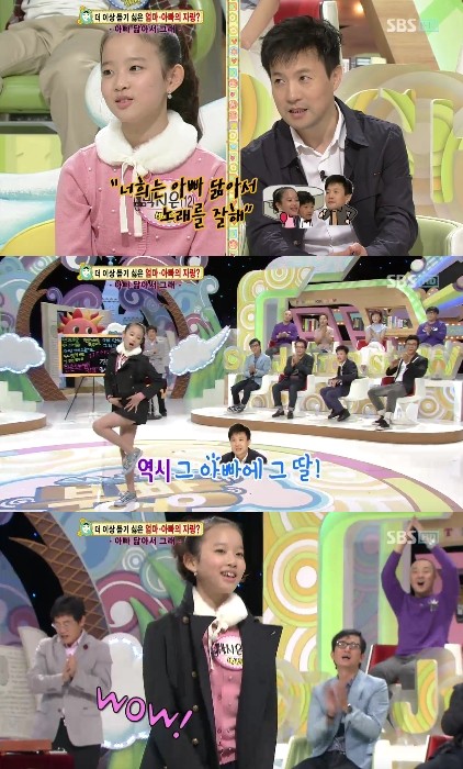 이에 딸 시은 양은 무대에 등장해 걸그룹 카라의 '판도라' 노래에 맞춰 완벽한 안무를 선보여 놀라움을 자아냈고, 박남정은 시은 양이 동요대회에서 1등도 했었다며 딸의 끼에 흡족해하는 모습을 선보였다.
