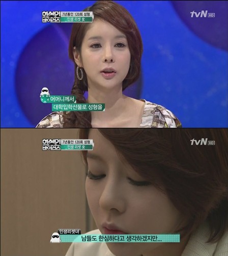 이날 방송에서 '인생 리셋녀'는 성형을 결심하게 된 이유를 묻는 질문에 "어머니께서 대학 입학선물로 쌍커풀 수술을 해주셨다. 대학 들어가 보니 사람들의 나를 대하는 시선과 대우가 달라졌고, 이후 계속 성형을 하게 됐다"고 전했다.