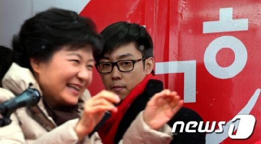 박근혜 새누리당 대선후보가 6일 오후 경기도 안양시 동안구 호계동 범계역 앞에서 유세차량에 올라 지지를 호소하는 모습을 조카인 가수 은지원 씨가 바라보고 있다. 박 후보는 이날 안산, 부천, 안양, 성남 등 경기 남부권을 순회한다. 2012.12.06/뉴스1