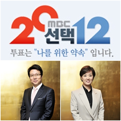 <MBC개표방송 메인로고(위), 개표방송 오프닝을 맡은 신동호 앵커(왼쪽아래)와 이언주 앵커(오른쪽 아래)>ⓒMBC