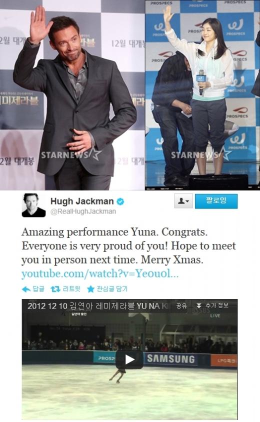 지난 10일 오후(현지시간) 휴 잭맨은 자신의 트위터에 "놀라운 연기였어요 연아! 축하합니다. 모두가 당신을 자랑스러워합니다. 다음에 직접 만날 기회가 있기를 바랍니다. 메리크리스마스(Amazing performance Yuna. Congrats. Everyone is very proud of you! Hope to meet you in person next time. Merry Xmas)"라는 축하의 메시지와 함께 영상을 게재했다.