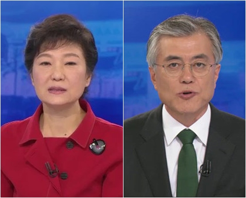 3차 토론에 나선 박근혜 후보(왼쪽)와 문재인 후보 <방송 화면 캡처>