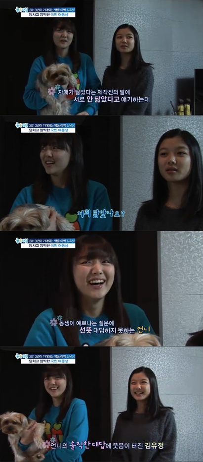 김유정·김연정 자매는 서로 닮았다는 제작진의 말에 당황하며 웃음을 지었다. 두 자매는 "서로 닮았다는 생각을 한 번도 안 해봤다"며 "오히려 서로는 얼굴 보면서 '되게 다르게 생겼다'고 이야기한다"라고 밝혔다.