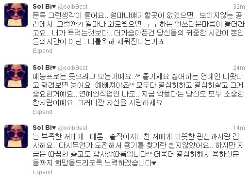 솔비는 14일 오전 자신의 트위터에 "문득 그런 생각이 들어요. 얼마나 얘기 할 곳이 없었으면 보이지 않는 공간에서 그럴까? 얼마나 외로웠으면..하는 안쓰러운 마음이 들더라고요"라고 말문을 열었다.
