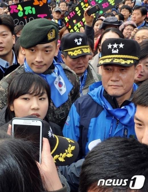 비는 '1·21사태' 45주년을 기념해 19일 오후 서울 종로구 일원에서 진행된 '제1회 서울시민과 함께하는 나라사랑 걷기대회'에 참석했다. 국방부 홍보지원단 소속인 비는 공무외출을 나간 사이 연인 김태희를 사적으로 만나는 등 군인복무 규율을 위반해 지난 8일 7일간의 근신 처분을 받았다.
