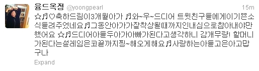 김옥정 씨는 25일 오후 자신의 트위터에 "축하 드림이 3개월 아기. 와우 드디어 트윗 친구들에게 이 기쁜 소식 들려주었네요. 그동안 아기가 잘 착상 될 때까지 인내심으로 참아내야만 했어요"라고 기쁨을 드러냈다.