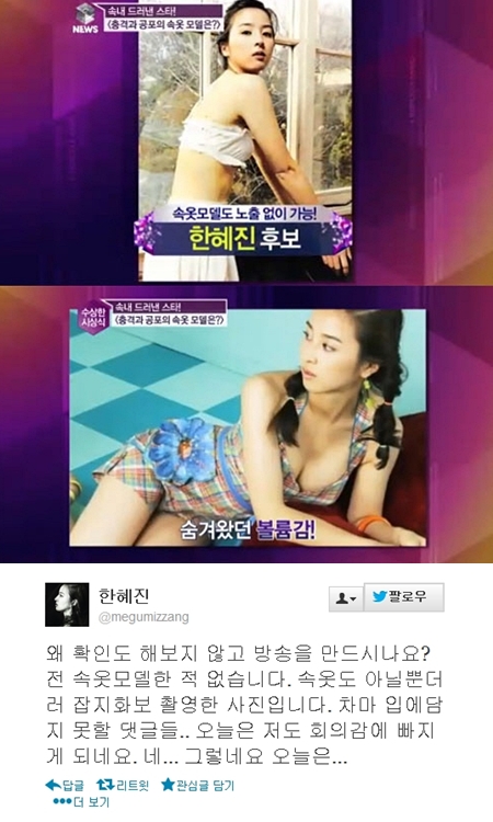 한혜진은 30일 오전 자신의 트위터에 "왜 확인도 해보지 않고 방송을 만드시나요? 전 속옷모델한 적 없습니다. 속옷도 아닐 뿐더러 잡지화보 촬영한 사진입니다"라는 글을 게재했다.