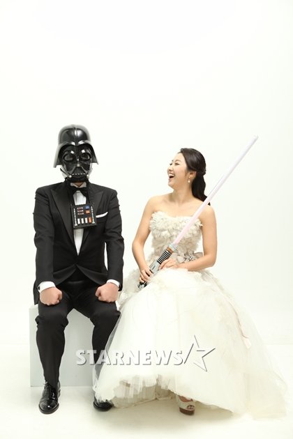 스타뉴스가 입수한 차미연 아나운서의 청첩장에는 하얀 웨딩드레스를 입은 신부 옆에 검은 다스베이더 가면을 쓴 예비신랑이 경직된 자세로 앉아있는 사진이 담겼다. 환한 웃음을 터뜨리고 있는 차 아나운서의 모습이 결혼을 앞둔 예비신부의 행복감을 드러낸다.