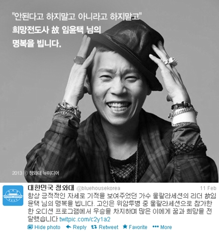 위암 투병 중 안타깝게 세상을 떠난 그룹 울랄라세션의 리더 임윤택을 추모하는 글이 청와대 트위터에 게재됐다,