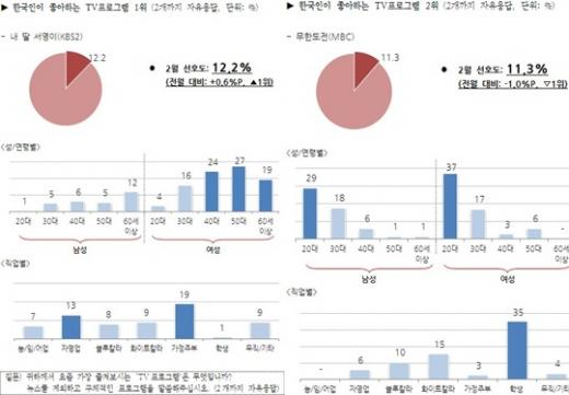 지난 1월 조사에서 1위를 차지했던 '무한도전'은 선호도 11.3%를 기록, 2위에 올랐다. 예능프로그램 중에서는 1위 기록이다. 20대(남 29%, 여 37%), 대학생(35%)들이 가장 좋아하는 TV 프로그램으로 나타났다.