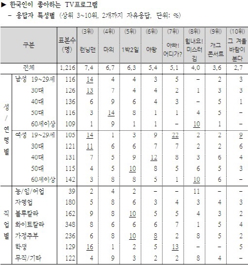 '런닝맨'은 20대, 대학생이 좋아했으며 '마의'는 50대 남성이, '1박2일'은 50대 여성, 블루칼라, 가정주부에서 높은 선호도를 보였다.