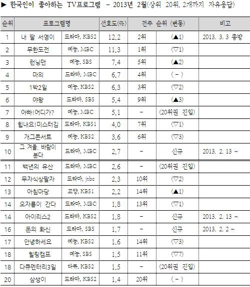 5일 리서치 회사 한국갤럽에 따르면 한국갤럽이 지난 2월 25일부터 28일까지 전국 만19세 이상 남녀 1216명을 대상으로 '한국인이 좋아하는 TV프로그램-2013년 2월'을 조사한 결과 '내 딸 서영이'가 선호도 12.2%로 1위를 차지했다. 이는 전월 2위에서 1위로 상승한 결과다.