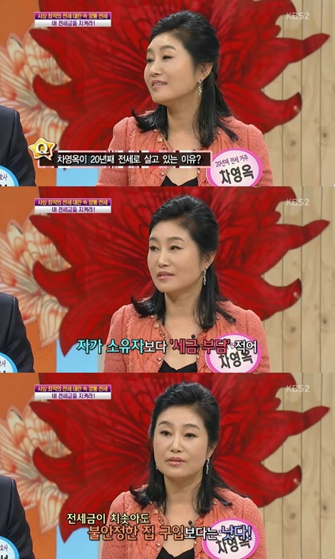 이날 차영옥은 "왜 자택을 구입하지 않고 전세를 사냐"는 MC 조영구의 질문에 "전세가 살기에 편하다"고 답했다.