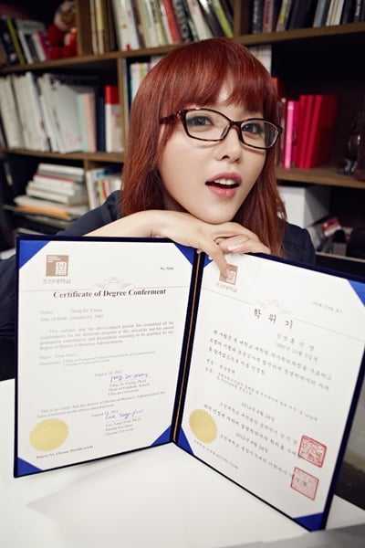 15일 소속사 키이스트를 통해 공개된 사진에서 홍진영은 박사 학위를 증명하는 학위기를 들고 포즈를 취하고 있다. 앞서 홍진영은 지난해 조선대학교 대학원경영학 박사학위 과정을 수료하고 시험과 논문심사에 합격, 올 12월 무역학 관련 박사학위를 땄다.