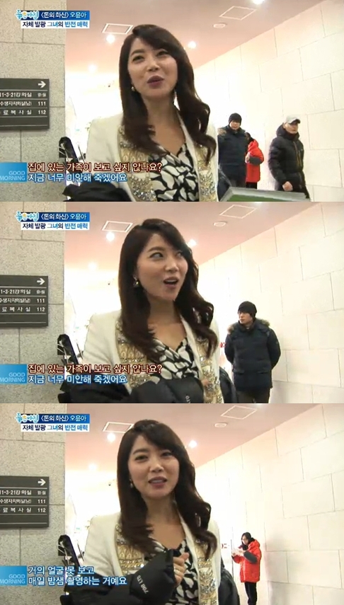 3일 오전 방송된 SBS '좋은 아침'에서는 드라마 '돈의 화신'에서 은비령으로 열연하고 있는 오윤아가 출연해 촬영 스케줄로 가족들과 만나지 못해 힘들다고 밝혔다.