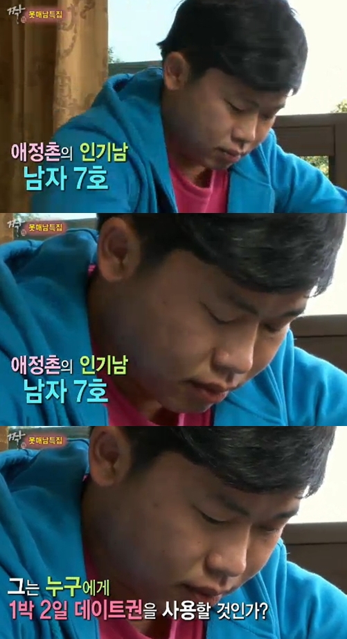 10일 오후 방송된 SBS '짝-못생겼지만 매력 있는 남자(못매남) 특집'에서 남자7호는 여자2호의 유부초밥을 받은 뒤 원래 호감을 갖고 있던 여자5호와의 사이에서 고민하는 모습을 보였다.