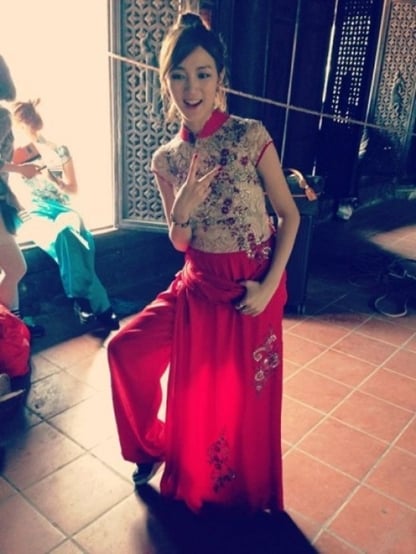 사진 속 지아는 화려한 장식이 달린 붉은 색 아오자이를 입고 손으로 브이를 그리고 있다. 지아는 장난기 가득한 표정과 포즈을 취하며 털털한 매력을 뽐냈다.