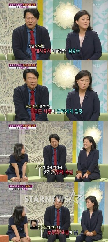 김응수는 29일 오전 방송된 KBS 2TV '여유만만'에 그의 아내와 둘째 딸과 함께 출연해 솔직한 입담을 과시했다.