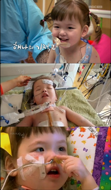 지난 13일 방송 된 MBC 가정의달 특집 '휴먼다큐 사랑-해나의 기적' 2편에서는 선천성 기도 무형성증을 앓고 있는 세 살짜리 아이 해나가 미국에서 줄기세포 인공기도 이식수술을 받는 모습을 그렸다.