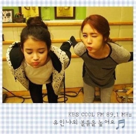이는 아이유가 유인나가 진행하는 KBS COOL FM ‘볼륨을 높여요’에 출연했을 때 찍은 것으로 공개된 사진에는 볼에 바람을 넣고 귀여운 표정을 짓고 있는 아이유과 유인나의 모습이 담겨져 있다.