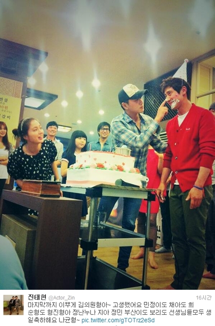 진태현은 지난 29일 자신의 트위터에 "마지막까지 예쁘게 김 의원 형아~ 고생했어요. 민정이도 채아도 희순 형도 형진 형아, 정난 누나, 지아, 정민, 부산이도 보리도 선생님들 모두. 생일 축하해요 나균 형"이라는 글과 함께 한 장의 사진을 게재했다.