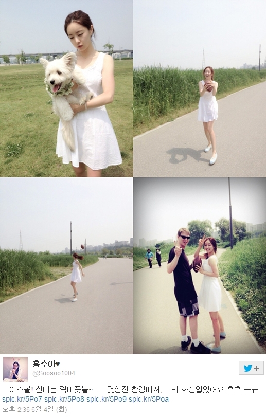 홍수아는 5일 자신의 트위터에 "나이스 볼! 신나는 럭비풋볼. 몇 일전 한강에서 다리 화상 입었어요 흑흑"이라는 글과 함께 여러 장의 사진을 게재했다.