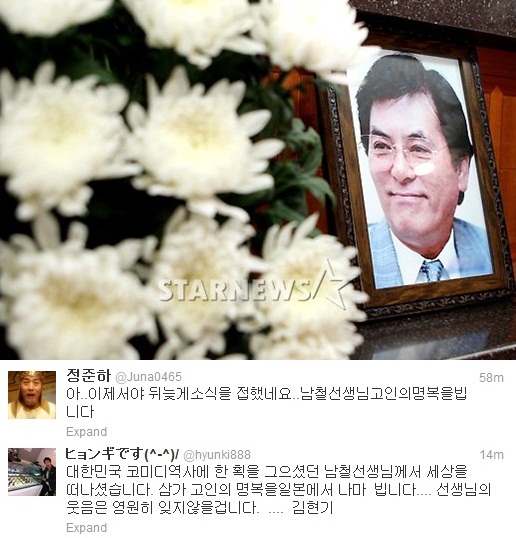 정준하는 22일 오전 자신의 트위터에 "아, 이제서야 뒤늦게 소식을 접했네요. 남철 선생님 고인의 명복을 빕니다"라는 글을 올렸다.