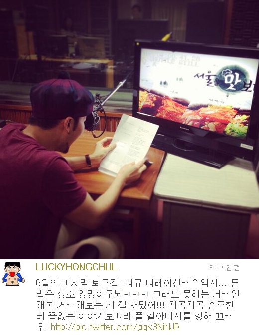 노홍철은 1일 오전 자신의 트위터에 "6월의 마지막 퇴근길! 다큐 내레이션~ 역시.. 톤 발음 성조 엉망이구나. 그래도 못하는 거~ 안 해본 거~ 해보는 게 제일 재밌어! 차곡차곡 손주한테 끝없는 이야기보따리 풀 할아버지를 향해 고우!"라는 글과 함께 사진을 게재했다.